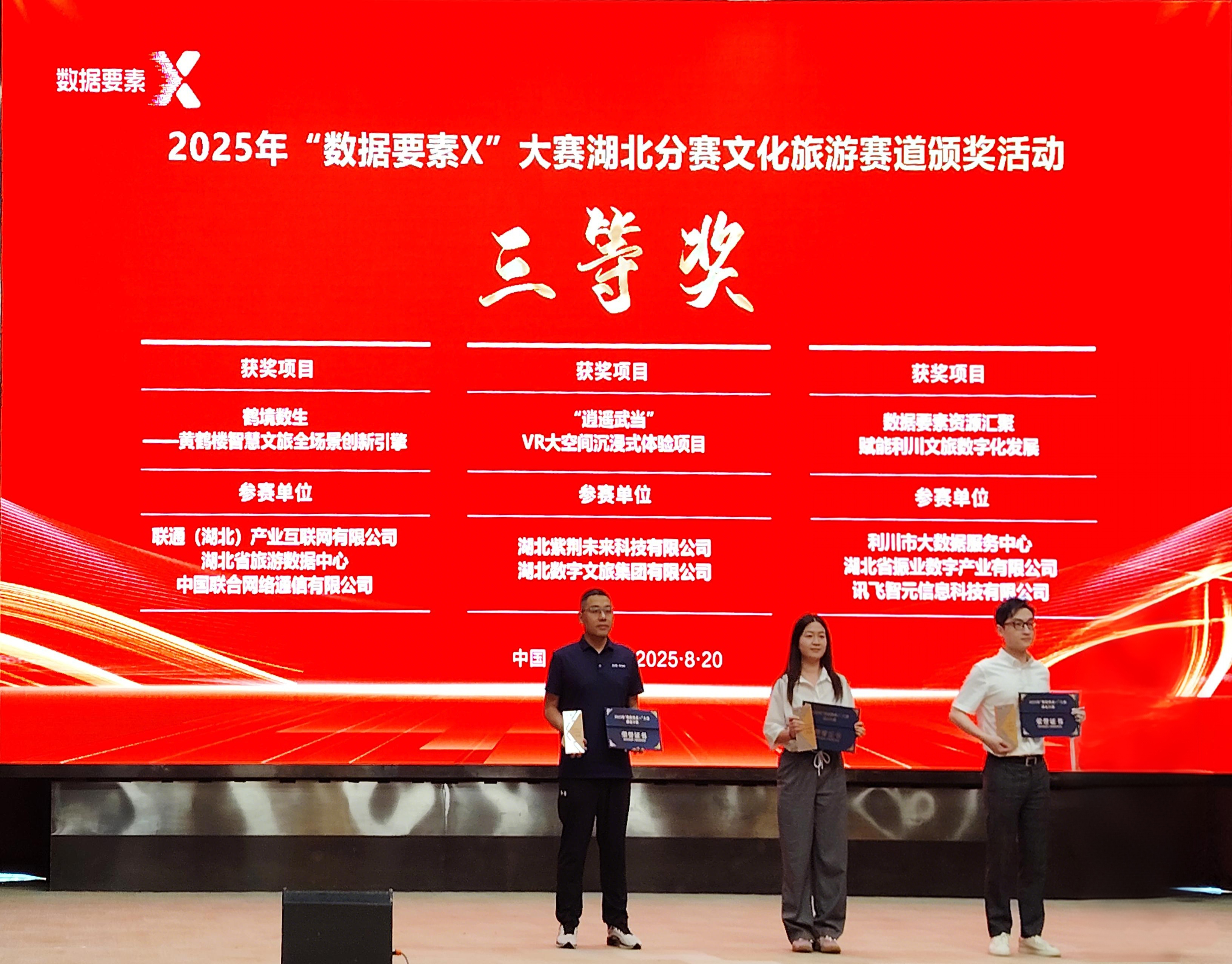 8月20日,由湖北省數(shù)據(jù)局、湖北省文化和旅游廳、十堰市人民政府主辦的2025年“數(shù)據(jù)要素×”大賽湖北分賽文化旅游賽道決賽活動(dòng)在十堰成功舉行。數(shù)旅集團(tuán)參賽項(xiàng)目均獲得獎(jiǎng)項(xiàng),湖北文旅全域智慧旅游綜合服務(wù)平臺(tái)獲二等獎(jiǎng)(賽道第2名)、“逍遙武當(dāng)”VR大空間沉浸式體驗(yàn)項(xiàng)目獲三等獎(jiǎng)(賽道第4名)、無人機(jī)航拍服務(wù)平臺(tái)和智景游景區(qū)綜合運(yùn)營管理平臺(tái)獲優(yōu)秀獎(jiǎng)。在參賽數(shù)量、入圍率及獎(jiǎng)項(xiàng)層級(jí)上均實(shí)現(xiàn)顯著突破,充分彰顯了公司在數(shù)據(jù)要素領(lǐng)域的技術(shù)積累與創(chuàng)新實(shí)力。